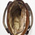 Oilskin chocolate kombiniert mit Wachstuch Federn, Aussenfach mit Reissverschluss über die ganze Breite. Innen beschichteter Canvas, 3 Innenfächer & Schlüsselband mit Karabinerhaken und 1 RV-Fach über die ganze Breite. Die Schulterbänder (Fischgrat braun-beige, weiche Qualität) sind längenverstellbar, 2 Handtragbänder und 1 längenverstellbares, abnehmbares Schulterband.